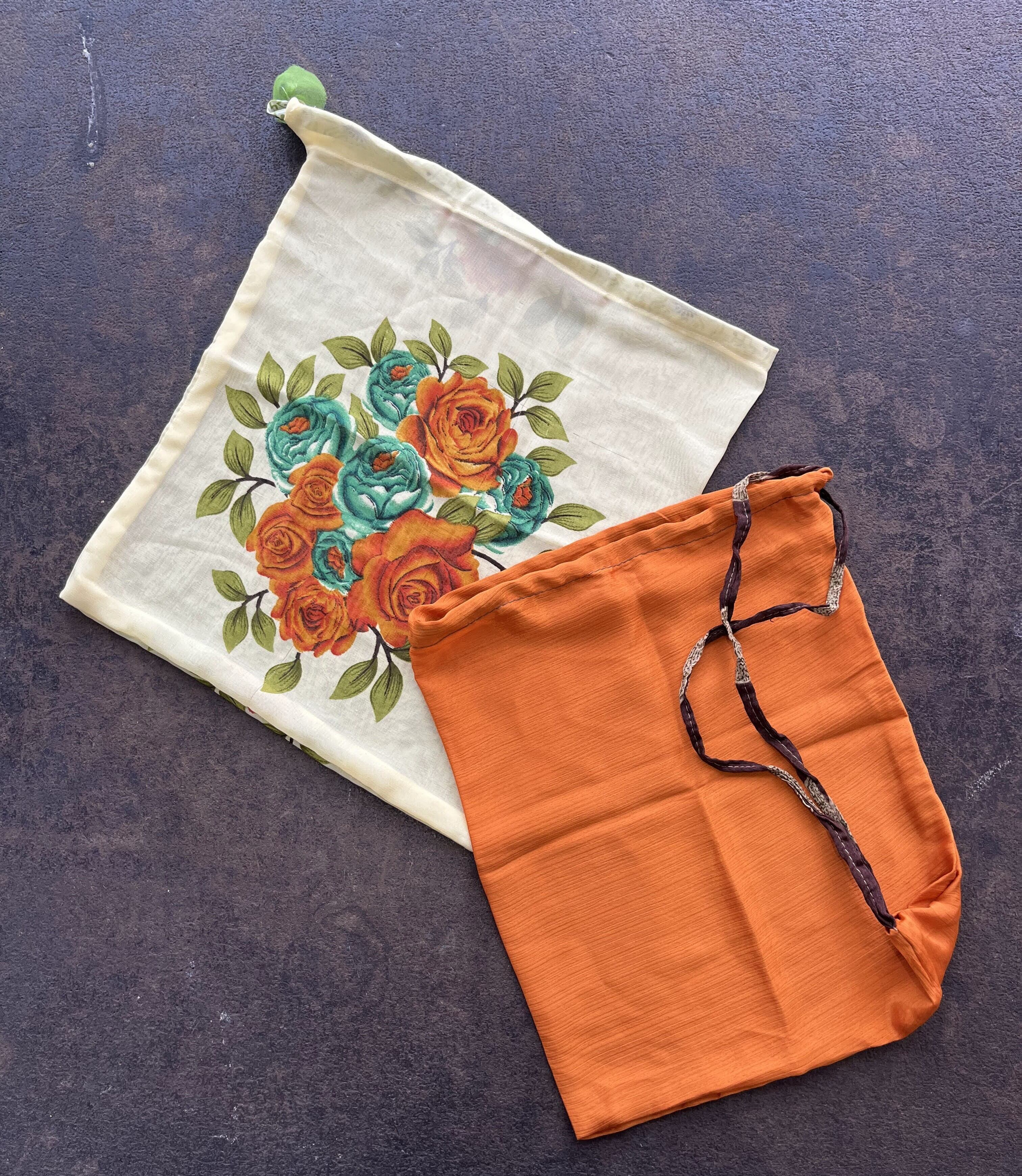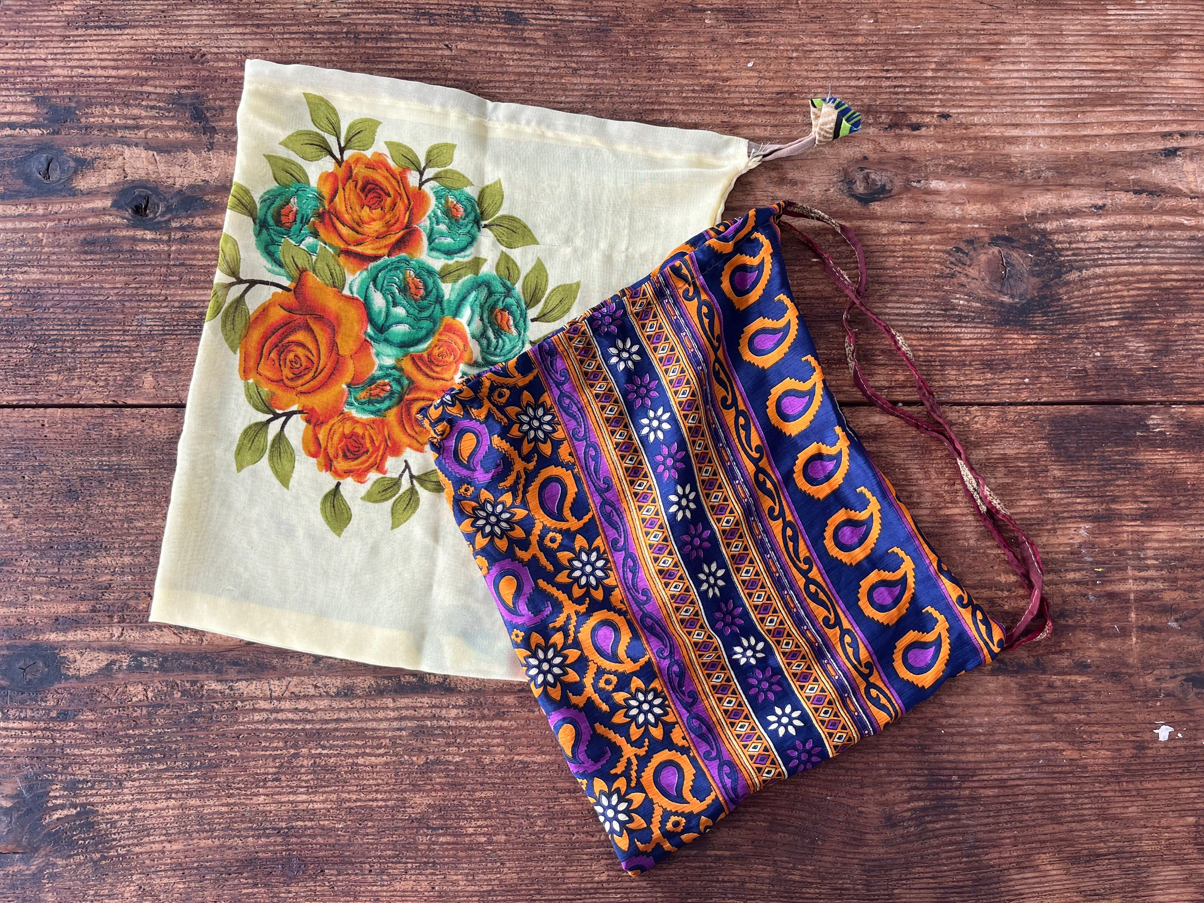 衣類としての役目を終えたサリーの生地を使って作られた巾着です。