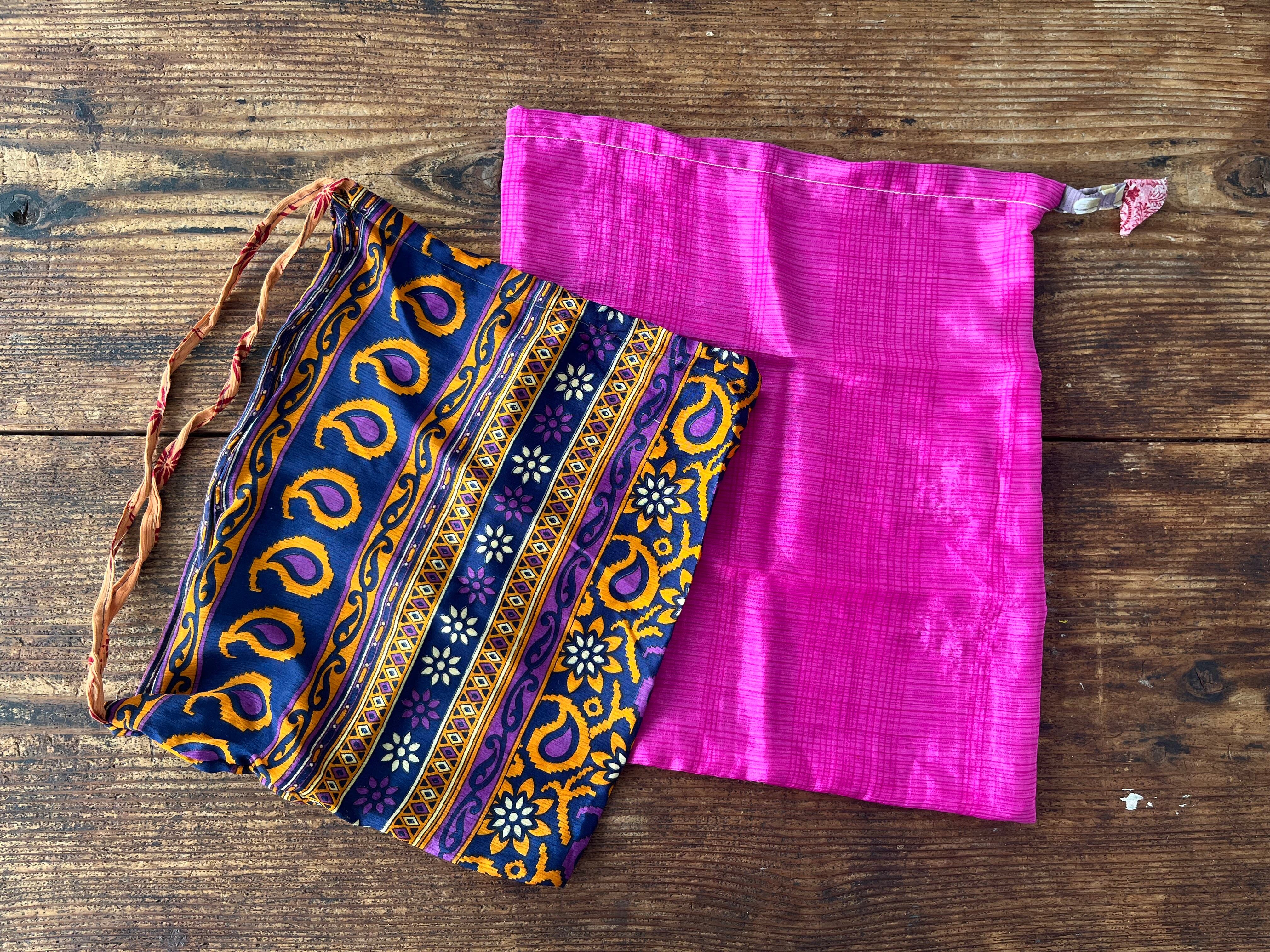 衣類としての役目を終えたサリーの生地を使って作られた巾着です。