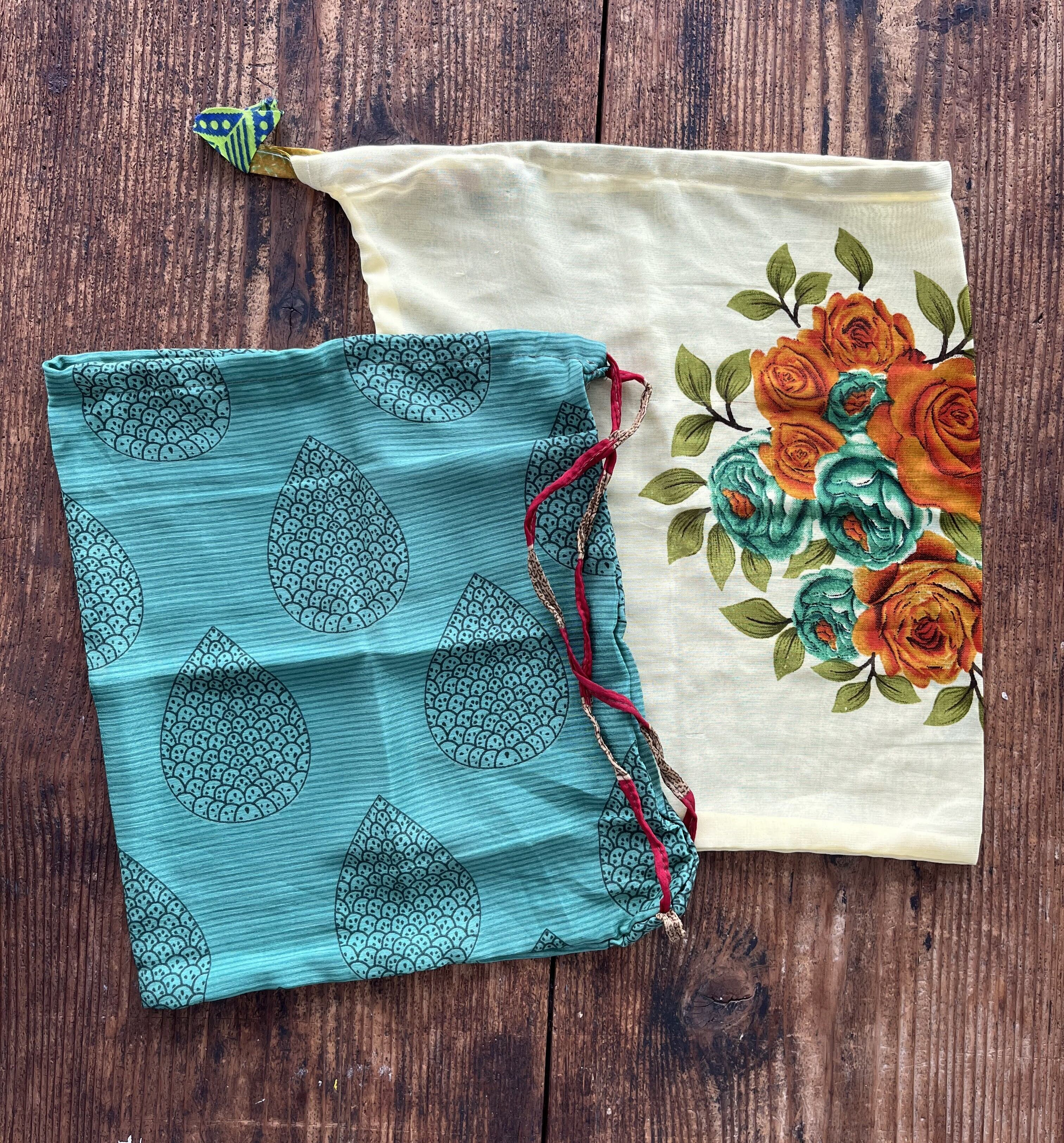 衣類としての役目を終えたサリーの生地を使って作られた巾着です。