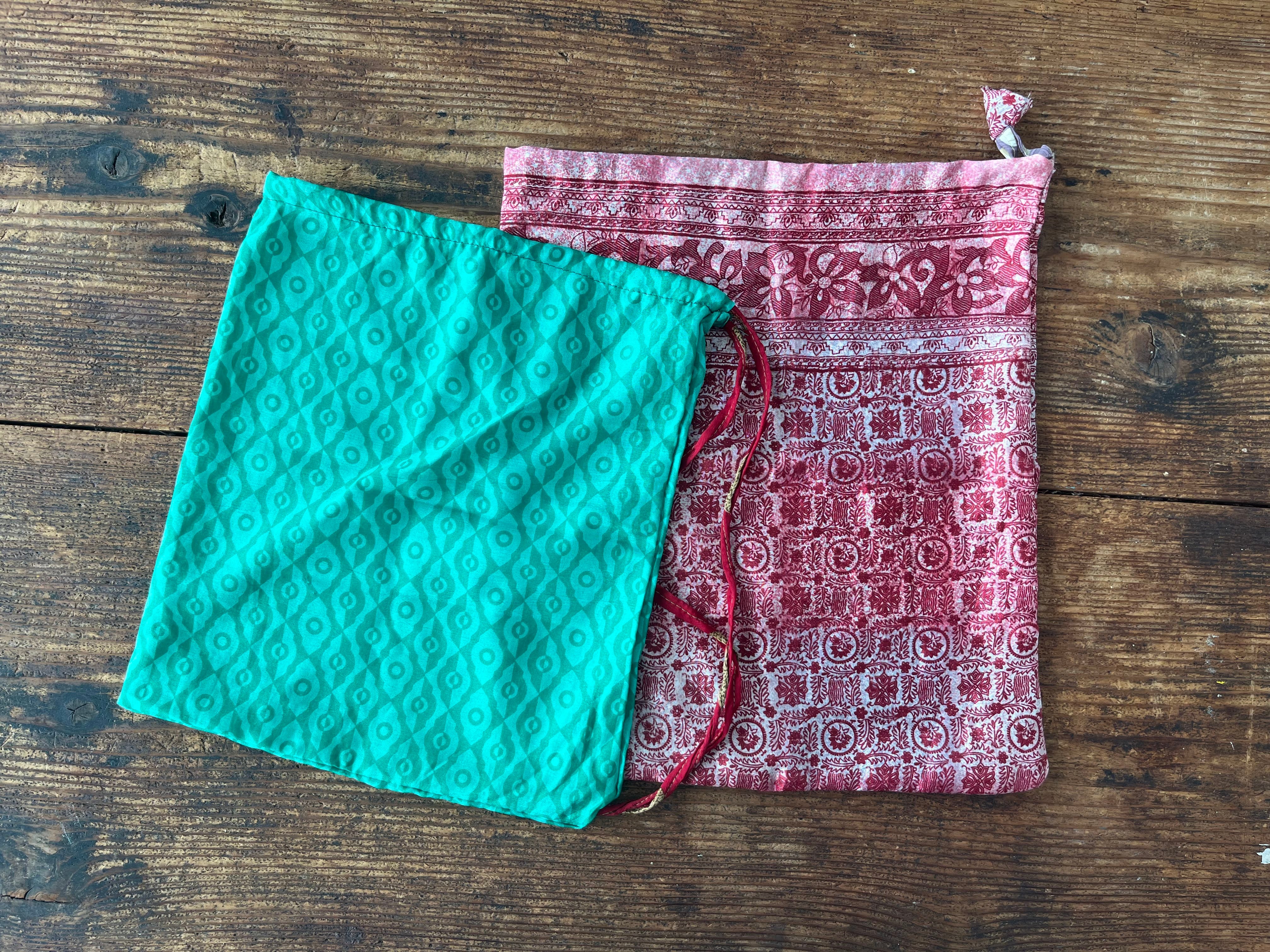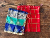 衣類としての役目を終えたサリーの生地を使って作られた巾着です。